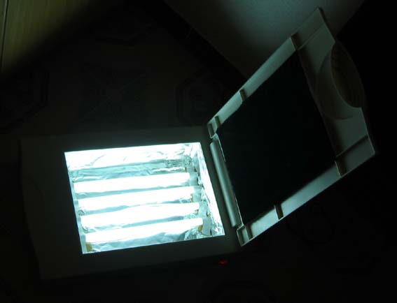 Una vez tengais todo, lo tendreis que montar dentro de la caja (hacedla de forma que entre todo bien olgado), a continuación estaria bien que pongais algo en el suelo y las paredes de la caja que refleje la luz hacia la parte superior (en mi caso he colocado unos cartones recubiertos de papel de plata haciendo de pantalla).