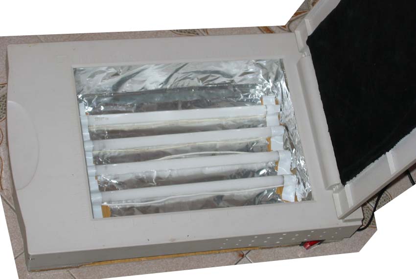 Ahora teneis que buscar un vidrio, placa de metracrilato o lo que sea para ponerlo encima de la caja y poder colocar vuestros circuitos a insolar encima (yo, como no, he usado el vidrio del escaner tal y como estaba), los fluorescentes deberian estar a 6-10cm del vidrio para que se distruvulla bien la luz y no se caliente la placa fotosensible (podria estropearse).